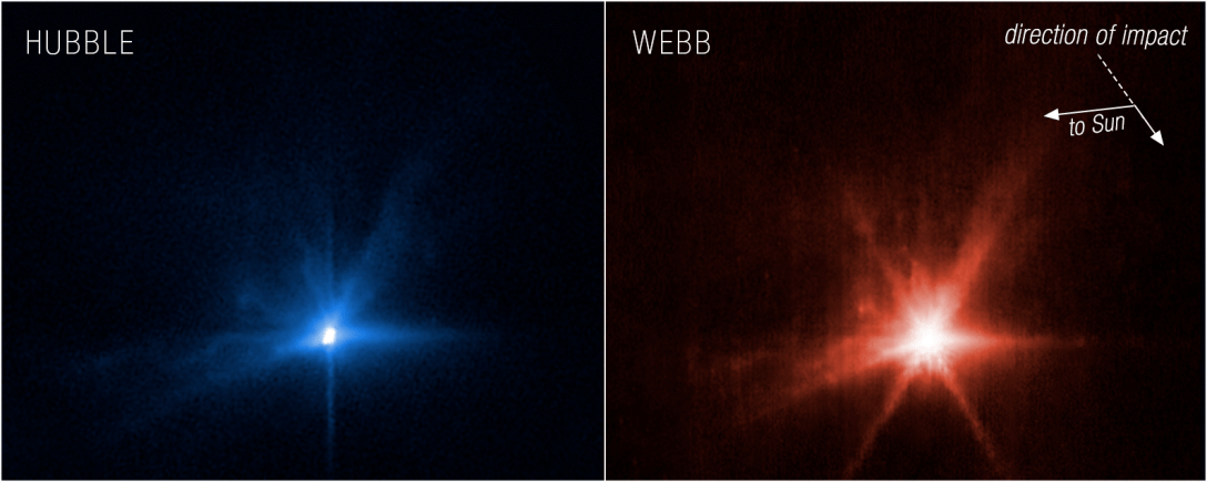 Космічний телескоп Вебба та телескоп Габбл зафіксували момент зіткнення апарату NASA з невеликим астероїдом Діморф, який є супутником астероїда Дідім на відстані 11 млн км від Землі.