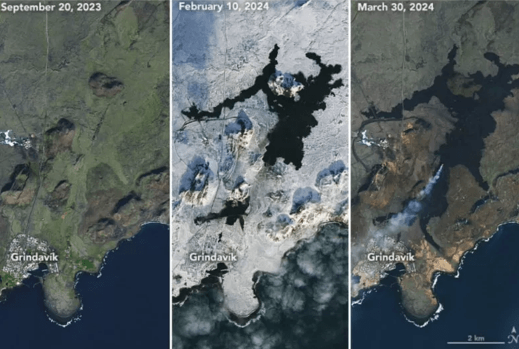 На зображеннях NASA, які зробили з космосу, можна побачити, як збільшується площа землі, яка обвуглена внаслідок виверження вулкана на півострові Рейк'янес, що розташований в Ісландії. Про це повідомляє Newsweek.