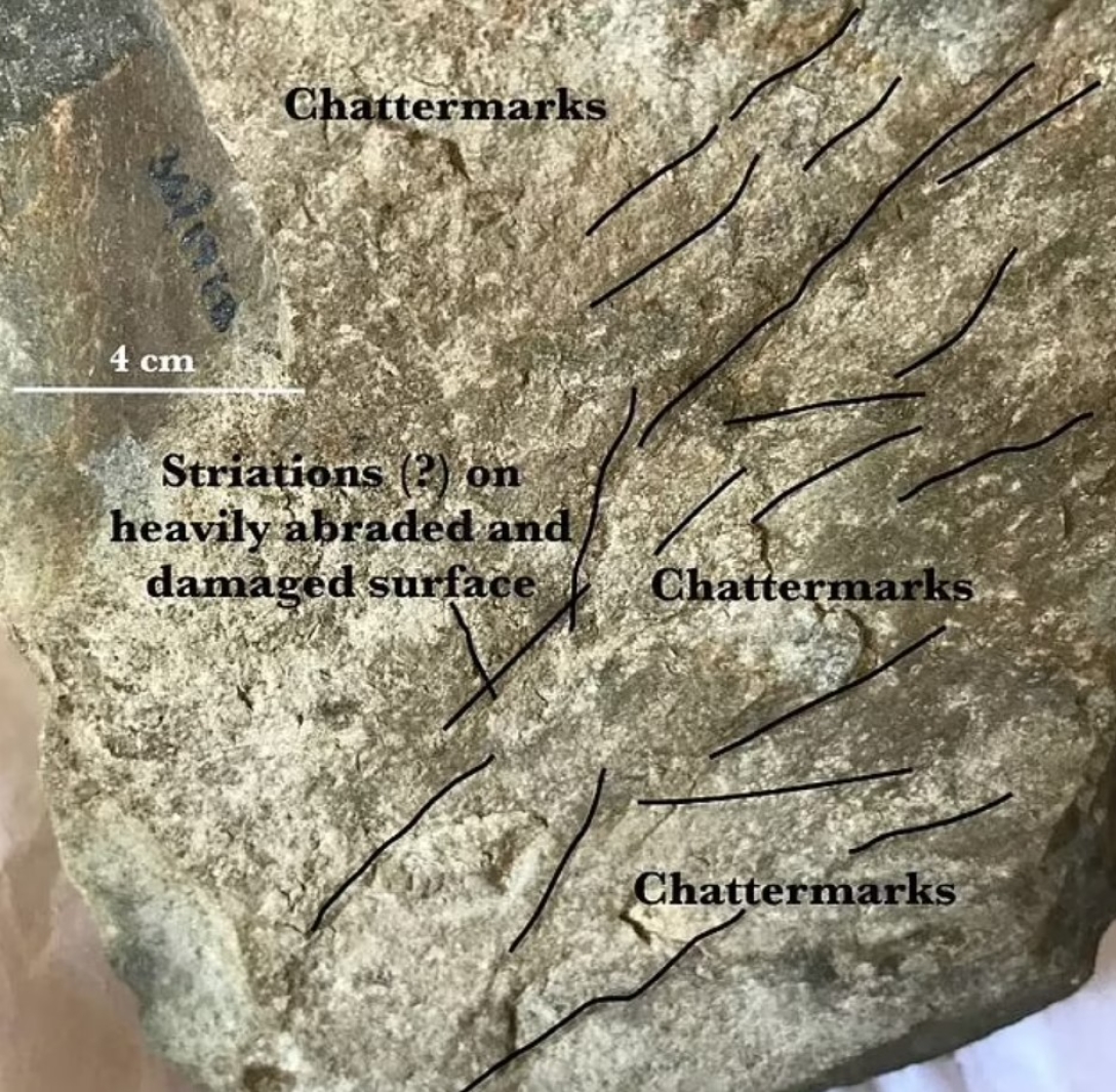 Також на валуні присутня низка подряпин і тріщин, які часто з'являються внаслідок льодовикового перенесення.