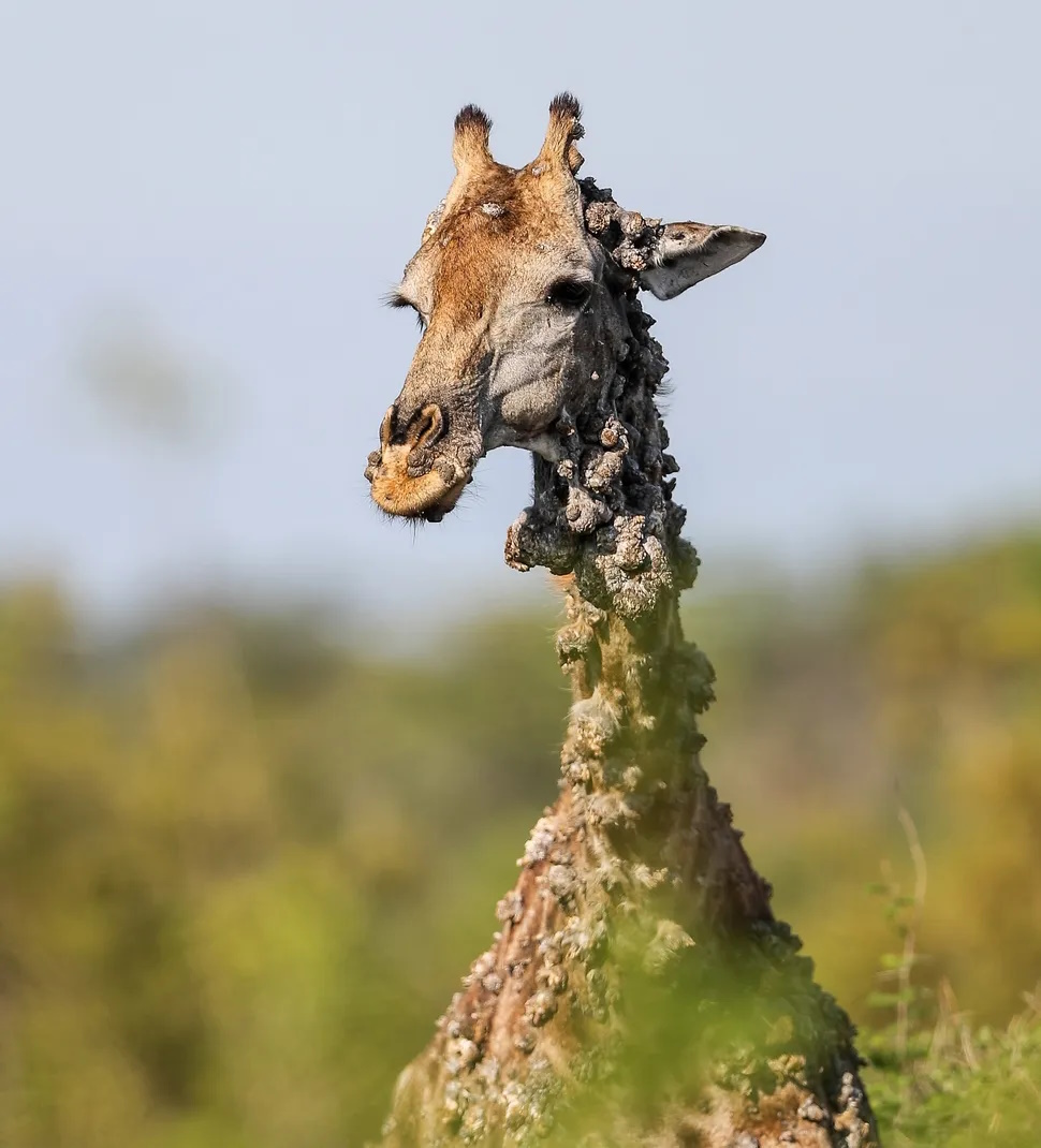 Фотографії незвичайного жирафа (Giraffa camelopardalis) були зроблені фотографом дикої природи Маріусом Нортьє в Національному парку Крюгера (Південна Африка). На знімках на тілі тварини видно нарости на морді, шиї та тулубі.
