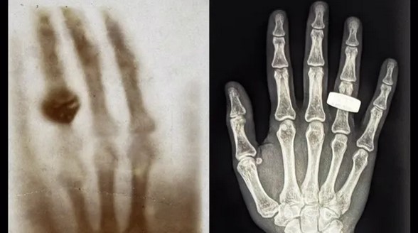 Перший рентгенівський знімок людини в космосі було зроблено під час місії Fram2 (праворуч). Екіпаж місії Fram2 вирішив віддати данину поваги найпершому рентгенівському знімку, на якому було зображено руку з кільцем (ліворуч)