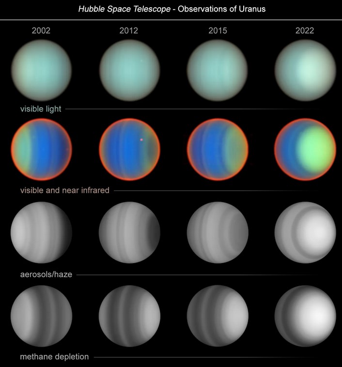 У третьому ряду показані оцінки вмісту аерозолю з використанням зображень у видимому світлі та інфрачервоному діапазоні світла. Світлі області наповнені хмарами з високим вмістом аерозолю, а темні області — з низьким вмістом аерозолю. Вчені з'ясували, що існують сезонні зміни рівня аерозолю. Астрономи вважають, що сезонні зміни є доказом того, що сонячне світло змінює рівні аерозольного туману на Урані.