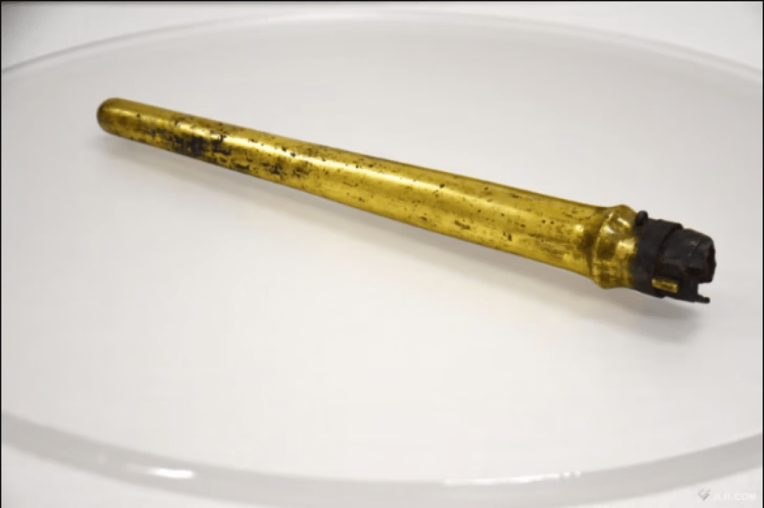 Знайдений у 1954 році під валуном на острові Окіносіма, 30,5-сантиметровий спис був вкладений у піхви з позолоченої бронзи, але донедавна залишався майже недослідженим.