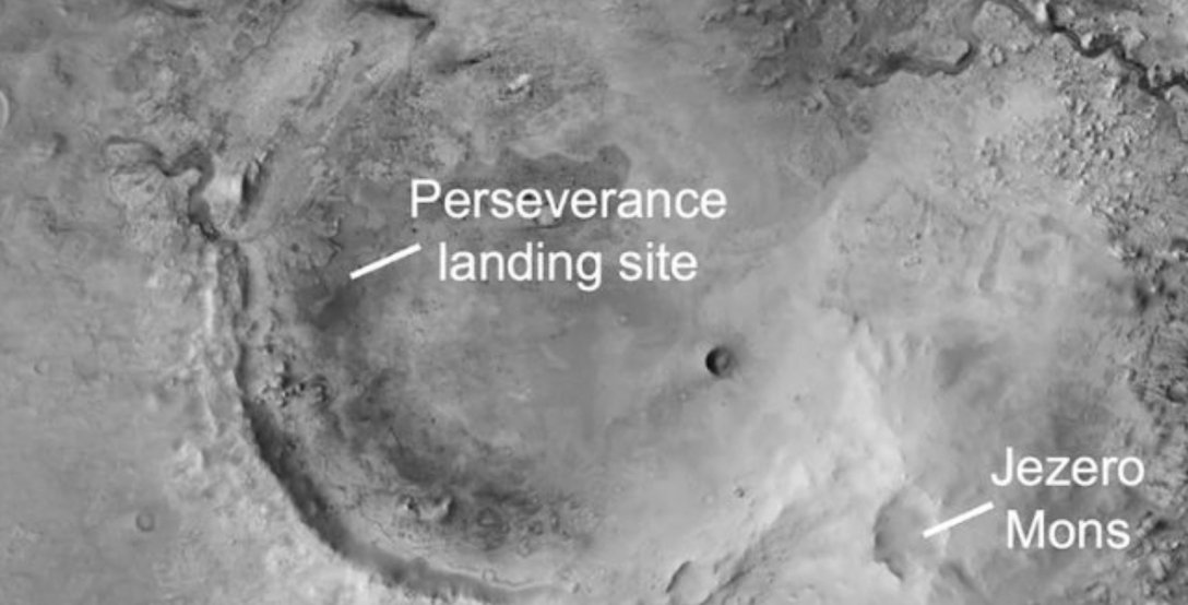 На знімку показано місце приземлення марсохода, а також гора Jezero Mons