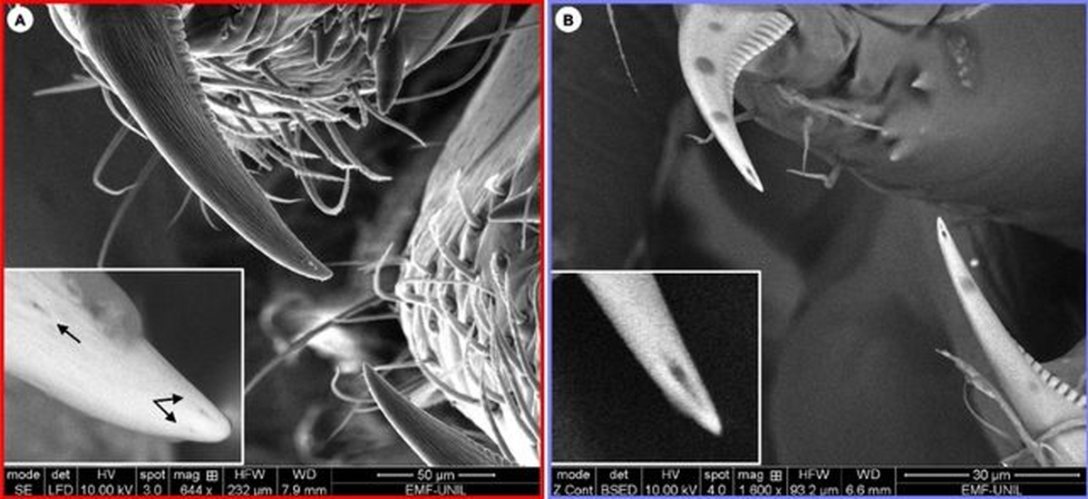 На іклах Uloborus plumipes (A) відсутня щілина, схожа на голку для підшкірних ін'єкцій, яка спостерігається на кінчиках отруйних іклів Parasteatoda tepidariorum (B