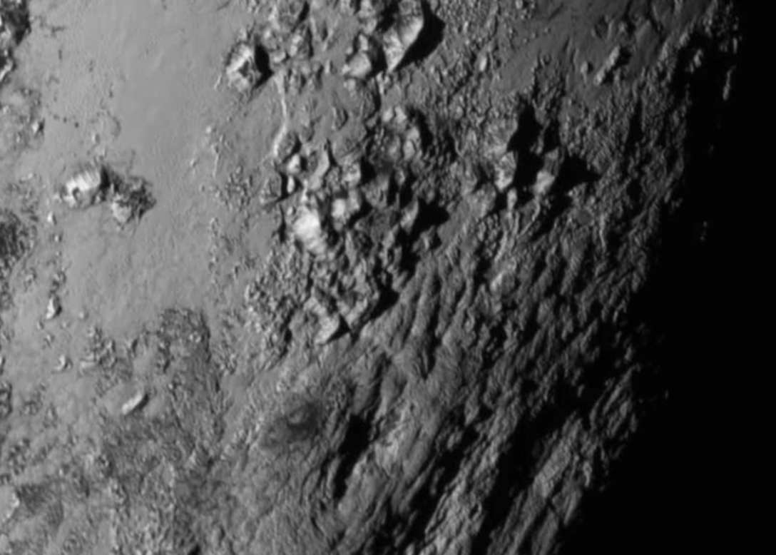 Також зонд "Нові горизонти" виявив крижані гори на Плутоні, висота яких сягає 3500 метрів. Гори розташовані вздовж екватора Плутона і, як вважають вчені, утворилися не більше 100 млн років тому. Таким чином це одне з наймолодших геологічних утворень у Сонячній системі, якій уже 4,5 млрд років.