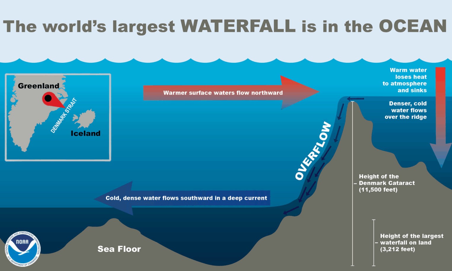 Найбільший підводний водоспад бере початок на глибині до 3050 метрів, де холодніша і щільніша вода з Північного моря обрушується в Атлантичний океан. Вода розширюється і створює потік потужністю 3,2 млн кубічних метрів на секунду.