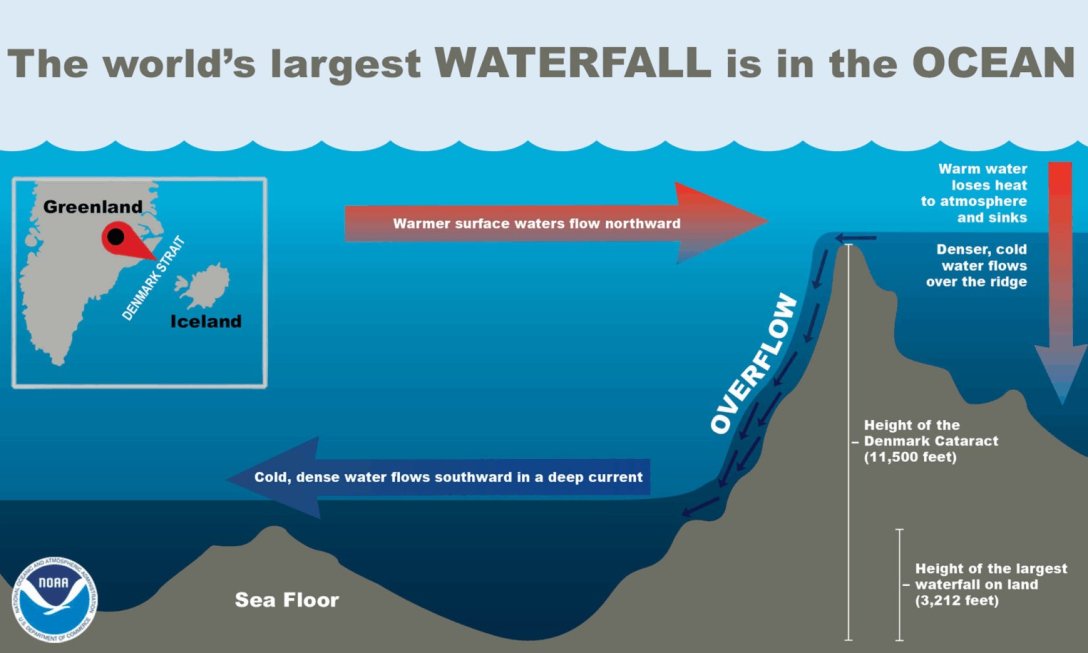 Водоспад Данської протоки є океанічним явищем, масштаби якого затьмарюють найвищі водоспади на поверхні нашої планети. Зазвичай водоспади на суші з'являються, коли річкова вода падає зі стрімких скель, але підводні вулкани формуються за зовсім іншим принципом, пише Daily Galaxy.