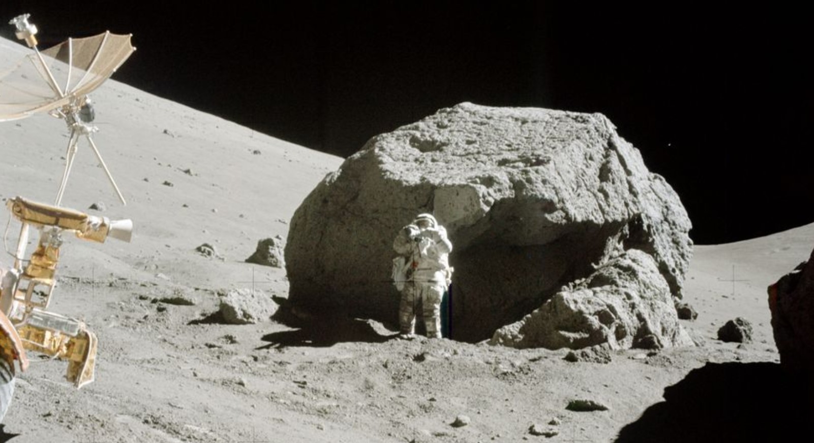 Астронавт Гаррісон Шмітт із місії "Аполлон-17" біля величезного каменя на Місяці