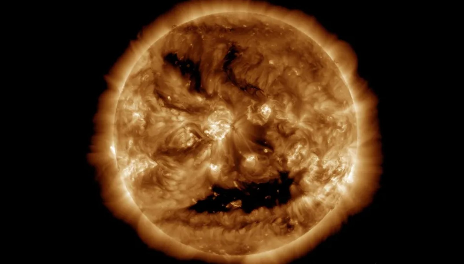 Унаслідок дивовижного збігу обставин темні корональні діри на Сонці, а також яскраві активні регіони нашої зірки об'єдналися, утворюючи щось, схоже на очі, що світяться, ніс і зловісну посмішку на поверхні Сонця.
