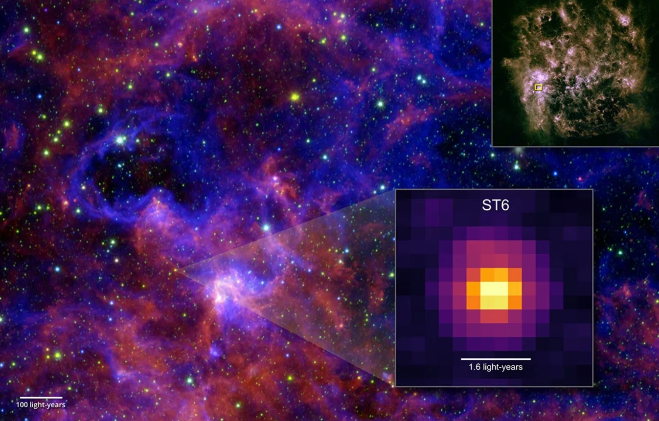 Розташування масивної зірки ST6 недалеко від гігантської туманності Тарантул у Великій Магеллановій Хмарі. На врізці представлений вид галактики в інфрачервоному діапазоні