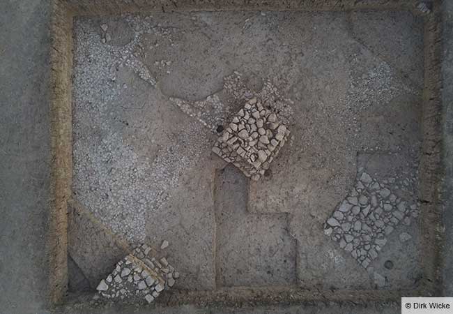 Щоб зрозуміти функцію споруди V століття, команда досліджувала велику територію навколо набору кам'яних стовпів, вперше помічених у 2015 році. Розкопки виявили цегляні стіни, утрамбовані підлоги та другий ряд стовпів, що вказує на тринефне планування з довгим центральним залом. Невелика кімната з напівкруглою нішею відповідала зразкам, відомим з релігійних будівель у північній Сирії та Верхній Месопотамії.