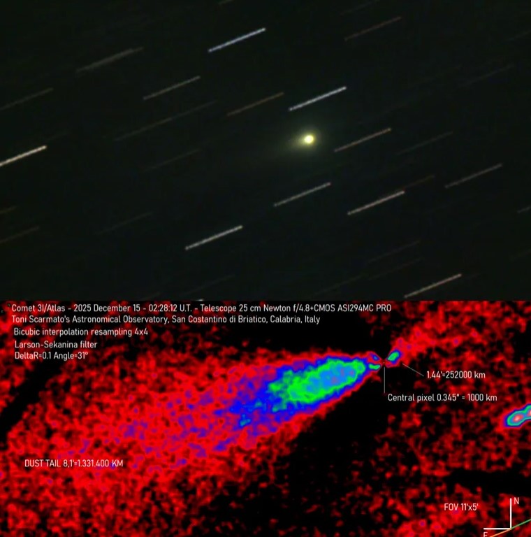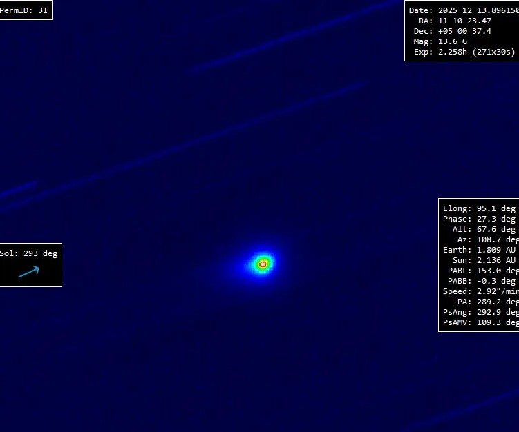 Нові фотографії показують, що у 3I/ATLAS все ще існує величезний антихвіст, який світиться і його довжина становить приблизно 500 000 км. Це дуже незвично для комет.