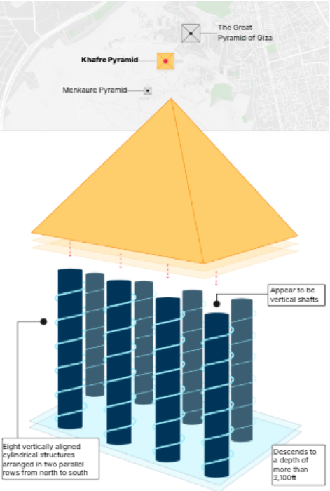 Італійські дослідники стверджують, що радіолокаційне сканування виявило велику підземну мережу під пірамідами Гізи, яка простягається на понад 1200 метрів. Вчені також повідомили про великий вертикальний шахтний ствол, що веде до камер під Сфінксом.