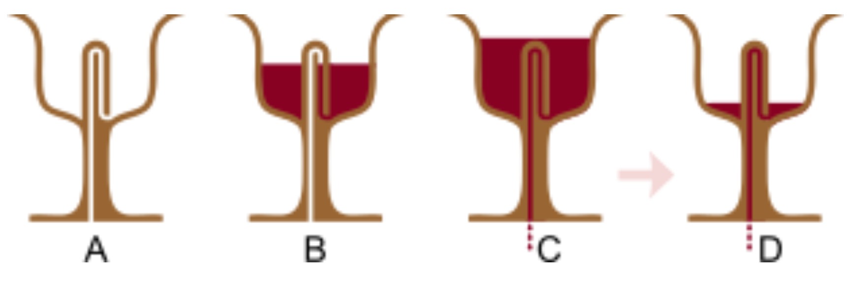 Коли чаша наповнена, її вміст може надходити до другої трубки та підійматися по ній у камеру у верхній частині центральної колони. Поки рівень рідини не підіймається вище рівня камери, чаша функціонує як зазвичай. Якщо хтось жадібно наллє рідину (з рівномірною густиною) вище за рівень колони, то сила тяжіння створить сифон у центральній колоні, внаслідок чого весь вміст чаші виллється через отвір в основі ніжки ("D").