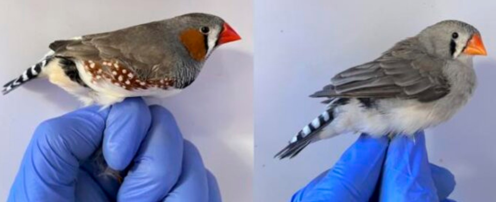 Самець (ліворуч) і самка (праворуч) зебрового зяблика. Помаранчеве пір'я самця забарвлене пігментом феомеланін