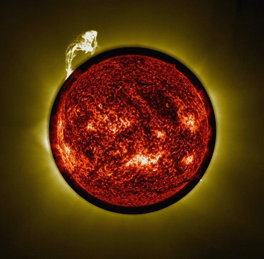 Анімація об'єднує дані коронографа ASPIICS на борту Proba-3, де жовтим кольором показано корону Сонця і дані приладу AIA апарату NASA Solar Dynamics Observatory, де показано темно-помаранчевим кольором диск Сонця.