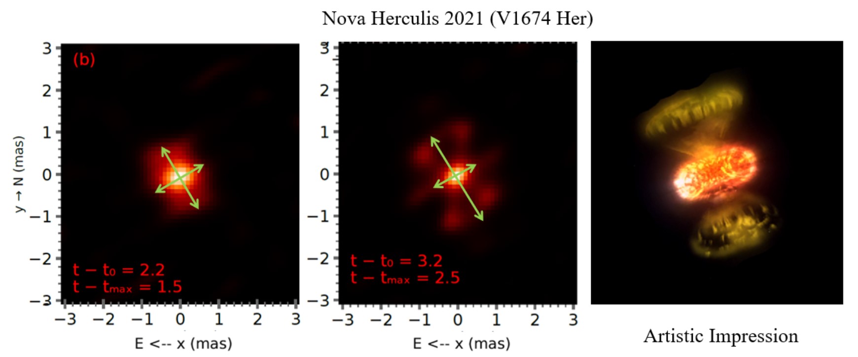 Учені отримали зображення вибуху нової на білому карлику V1674 Геркулес. Це один із найшвидших зоряних вибухів в історії спостережень. Зображення отримані через 2 дні (ліворуч) і 3 дні (посередині) після вибуху. Праворуч представлено художнє зображення вибуху новою