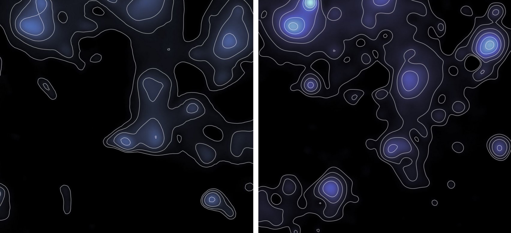 На цій карті показано розподіл темної матерії. Накладені контури відзначають області з однаковою щільністю темної матерії, виділяючи місця, де ця невидима матерія, показана тут синім кольором, найбільш сильно сконцентрована