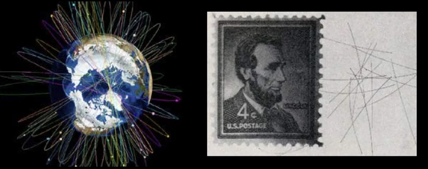 Орбітальна траєкторія космічного сміття від проєкту "Вестфорд" (ліворуч) і мідні голки, з яких складається це сміття в порівнянні з поштовою маркою (праворуч)
