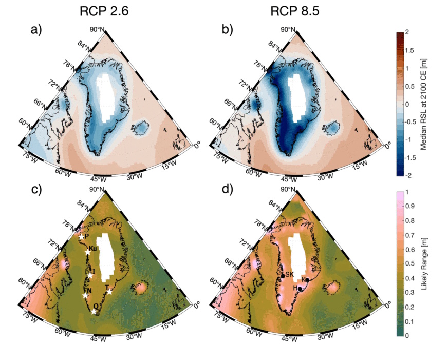 Прогнози загальної відносної зміни рівня моря показують, що рівень моря навколо Гренландії знизиться