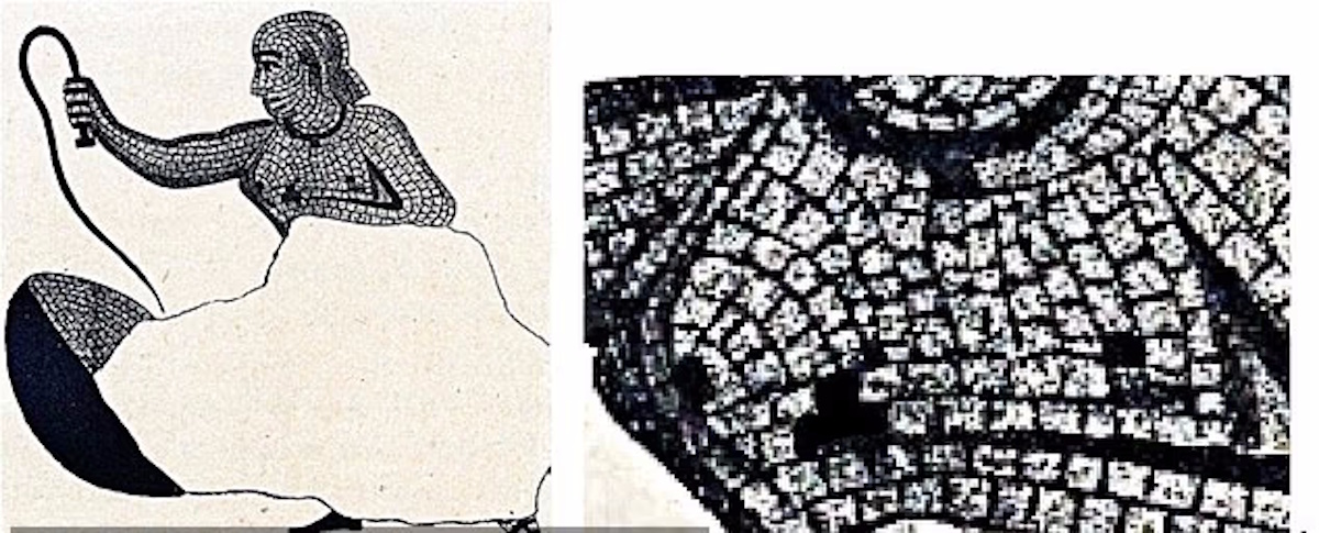 Уперше мозаїку вивчили 1862 року, але тоді вчені не змогли чітко визначити, хто на ній зображений. Уже тоді було висловлено припущення, що на мозаїці може бути зображено жінку — на це вказували зібране волосся і фігура на грудях, яка виступає. Утім, деякі експерти припустили, що це "паегніарій" — клоун з арени, який використовував батіг для битв з іншими.