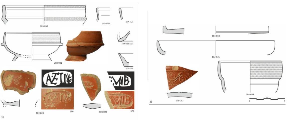 Серед найважливіших знахідок були гончарні клейма, пов’язані з Атеєм та Гаєм Вібієном, а також прикрашені фрагменти з майстерень у Ла-Грауфесенк у Галлії, що допомогло простежити походження виробництва та торгівельні зв’язки.