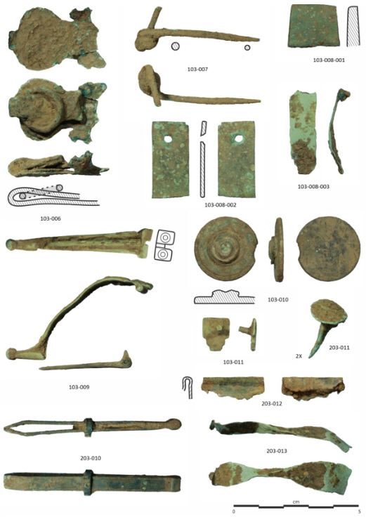 Металеві знахідки, хоча їх було менше, також були важливими. Археологи виявиди фібулу типу Ауцисса, яку зазвичай носили римські солдати, та чотири бронзові монети, викарбувані в таких містах, як Цезараугуста, Оска, Білбіліс та Емеріта-Августа. Відсутність пізніших монет підтвердила датування верхнього шару пізнім періодом правління Августа або раннім періодом правління Тіберія.