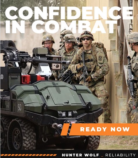 На навчаннях шестиколісний робот Hunter Wolf забезпечував логістичну та охоронну підтримку солдатів. Він оснащений дистанційно керованим великокаліберним кулеметом, що вказує на його ширшу функцію на полі бою. Безпілотна роботизована платформа може не перевозити вантажі, але також вести вогонь і займатися розвідкою.