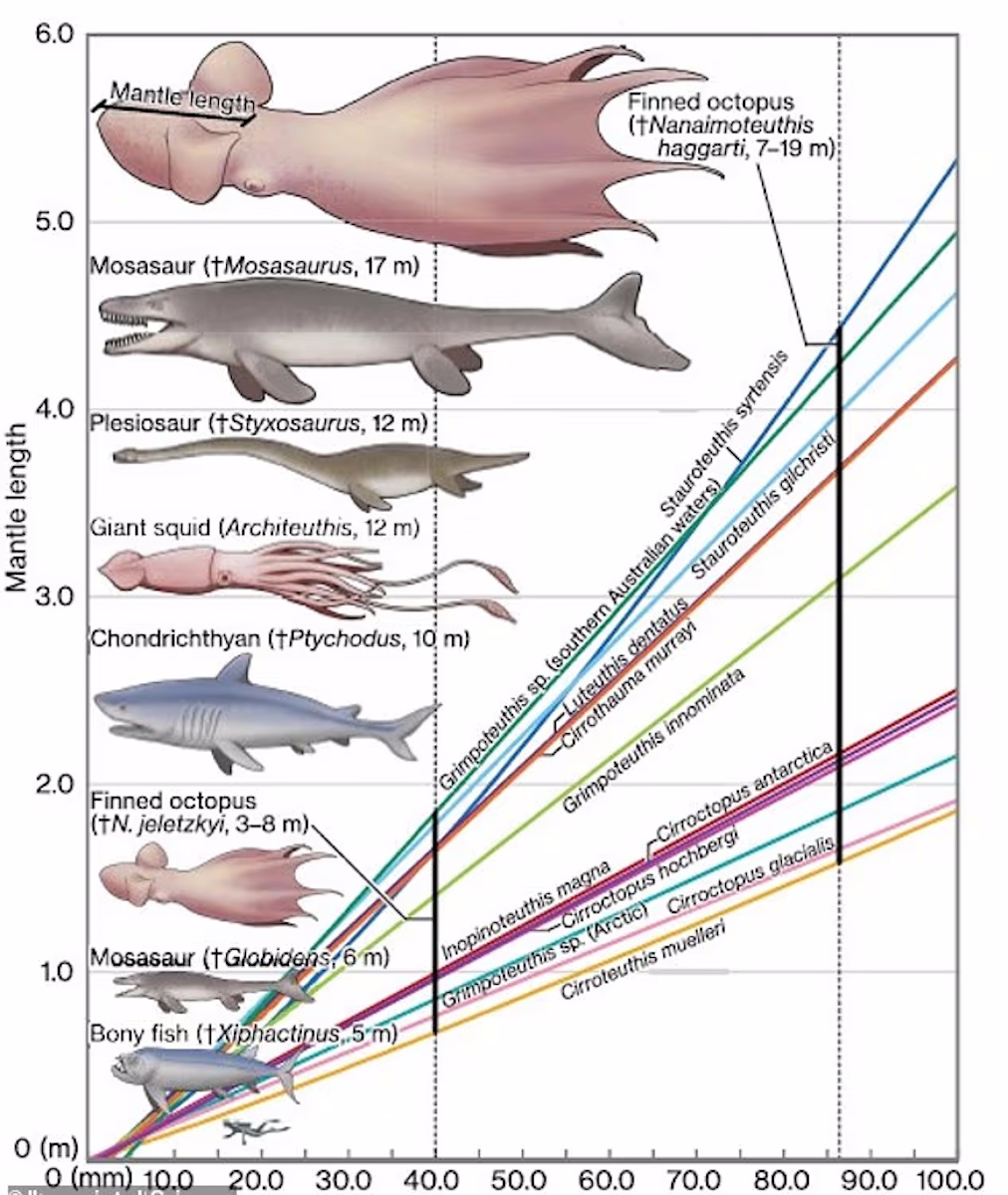 За словами авторів дослідження, величезні восьминоги, ймовірно, досягали 19 метрів завдовжки і можуть являти собою найбільших безхребетних з описаних, що змагаються з сучасними їм гігантськими морськими рептиліями. Для порівняння, середній зріст людини становить близько 1,7 метра, а слони досягають висоти лише близько 3 метрів. Простими словами, за довжиною ці морські гіганти могли зрівнятися з кашалотами — близько 20 метрів, але все ще поступалися синім китам, довжина яких може досягати 27 метрів.