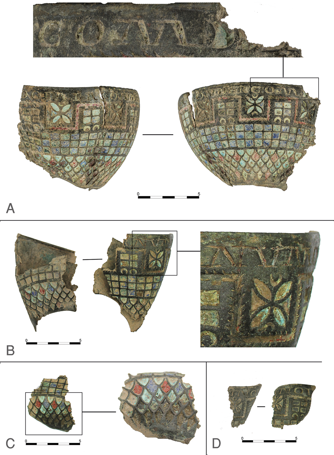 Емалеве оздоблення чаші включає червоне, зелене, синє та бірюзове скло. Ці кольори утворюють візерунки, що нагадують вежі та геометричні фігури, які часто інтерпретують як символічні зображення Адріанового валу та її оборонних споруд.