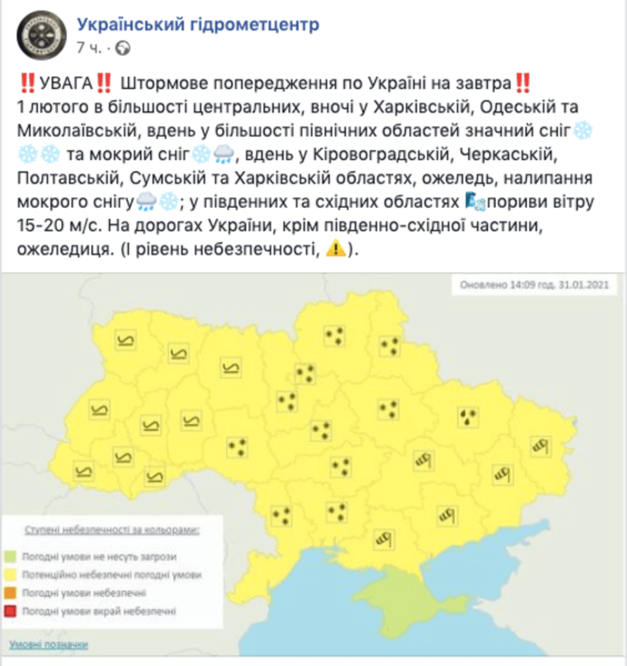 Вночі рясні снігопади і мокрий сніг очікуються в Харківській, Одеській та Миколаївській областях, вдень — на півдні України. Також вдень очікується ожеледь і налипання мокрого снігу в Кіровоградській, Черкаській, Полтавській, Сумській та Харківській областях.