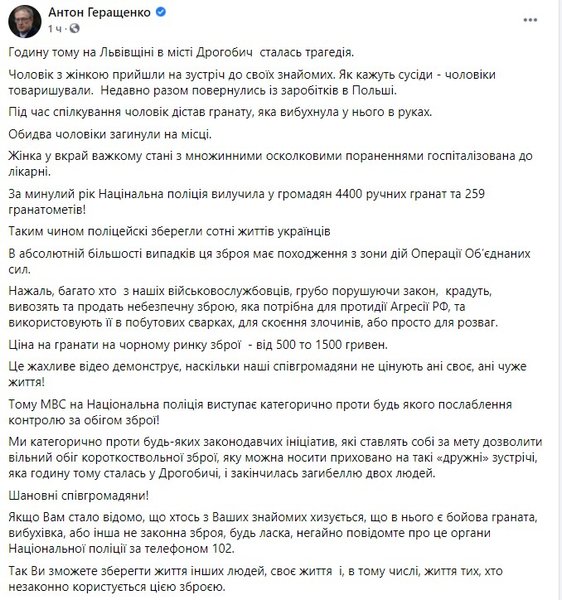 Натомість заступник глави МВС Антон Геращенко опублікував на своїй сторінці в Фейсбуці відео моменту вибуху і повідомив подробиці трагедії, проінформувавши, що вибухнула граната.