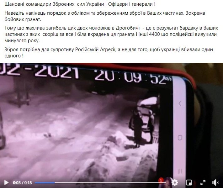 "Наведіть нарешті порядок з обліком і зберіганням зброї в ваших частинах. Зокрема бойових гранат. Тому що жахлива загибель двох чоловіків у Дрогобичі — це результат бардаку в ваших частинах, з яких, найімовірніше, і була вкрадена ця граната й інші 4400, які поліцейські вилучили в минулому році ".