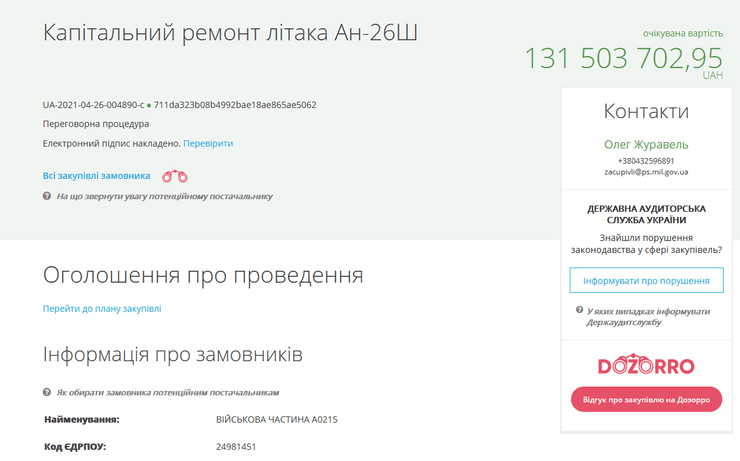 Командування повітряних сил України опублікували тендер на проведення капітального ремонту літака Ан-26Ш, який проведе "Завод 410 цивільної авіації". Про це повідомляється на сайті електронних торгів Prozorro.