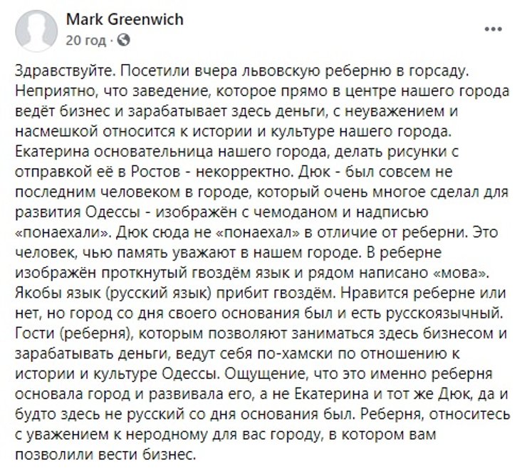 Власники закладу опублікували на своїй сторінці у Facebook пост, в якому український текст був написаний на російській розкладці клавіатури.