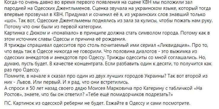 А харківський телепродюсер і режисер Лев Кокшаров відзначився постом з полярним змістом, зазначивши, що "одесити діляться не за мовним принципом, а на тих, кому дано почуття гумору, і кому в житті не пощастило" і нічого крамольного в постерах з ресторану він не бачить .