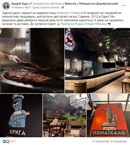 Цікаво, але ще 17 квітня, коли ресторан тільки відкривався, його власник Андрій Худо відзначив цю подію постом, у якому фігурував і один зі спірних постерів — той, який з Дюком. Тоді це зображення обурення не викликало, швидше за все, реакція була цілком благодушною.