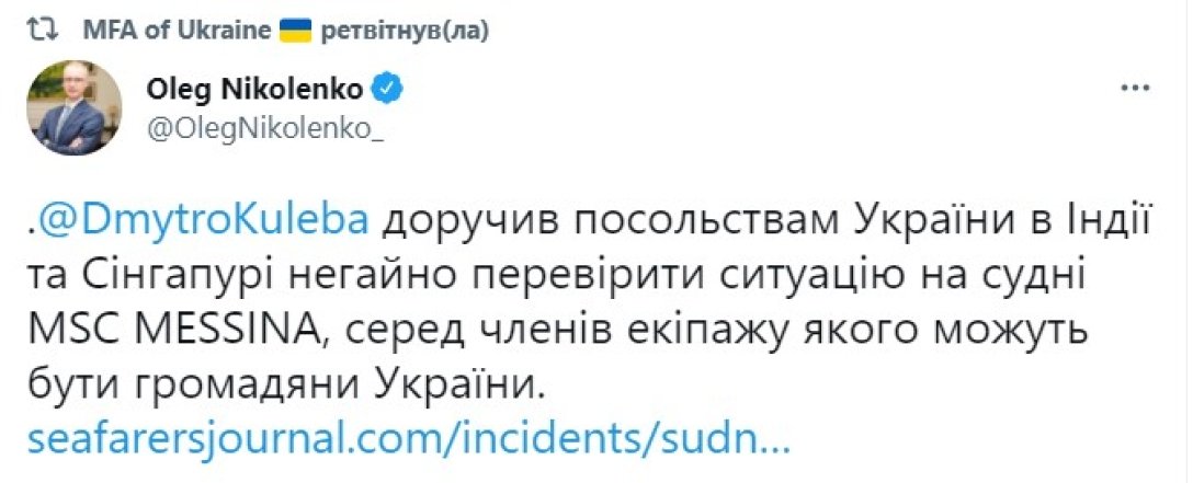 Спікер українського МЗС Олег Ніколенко вже відреагував на інформацію про те, що трапилося. Він написав в Twitter, що глава зовнішньополітичного відомства Дмитро Кулеба "доручив посольствам України в Індії та Сінгапурі негайно перевірити ситуацію на судні MSC Messina, серед членів екіпажу якого можуть бути громадяни України".