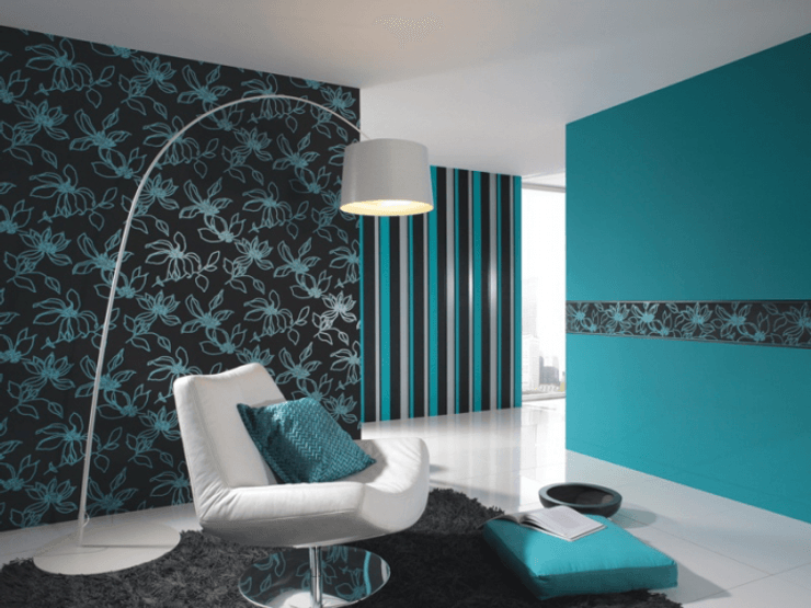 Комбіновані шпалери в залі з різним малюнком можна зробити на замовлення за індивідуальним ескізом у компанії Walldeco.