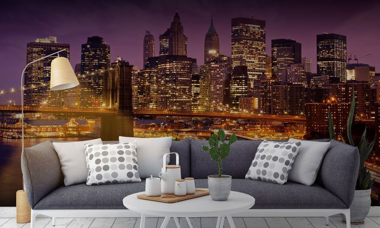 Місто є одним із трендів шпалер для вітальні. При цьому використовується монохромна обробка, коли зразки виконуються в декількох відтінках одного кольору, а також комбінування малюнків у межах одного полотна.