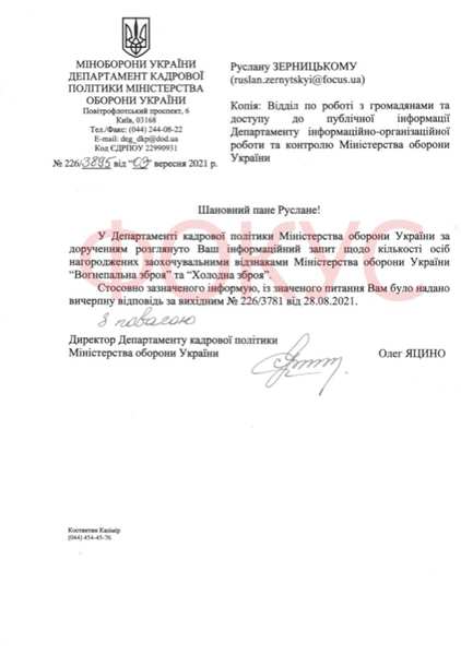 "Повідомляю, що в 2021 році заохочувальними нагородами Міністерства оборони України нагороджені 5 482 особи", — йдеться у відповіді на запит, під яким стоїть підпис директора Департаменту кадрової політики Міноборони Олега Яцини.