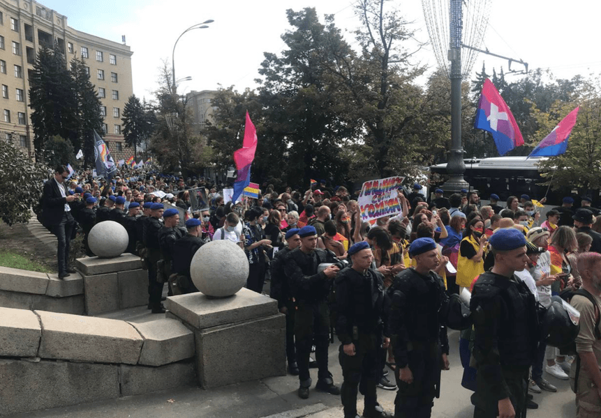 Учасники прайду зібралися на площі Свободи і пройшли колоною дві станції метро по одному з проспектів. Не обійшлося без націоналістів — вони зібрали контрмітинг.