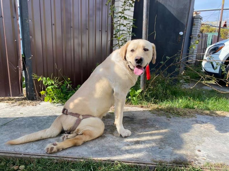 За словами жінки, дворічного лабрадора збила машина, в результаті чого у нього паралізувало задню частину тіла, тварина зможе пересуватися тільки за допомогою коляски.