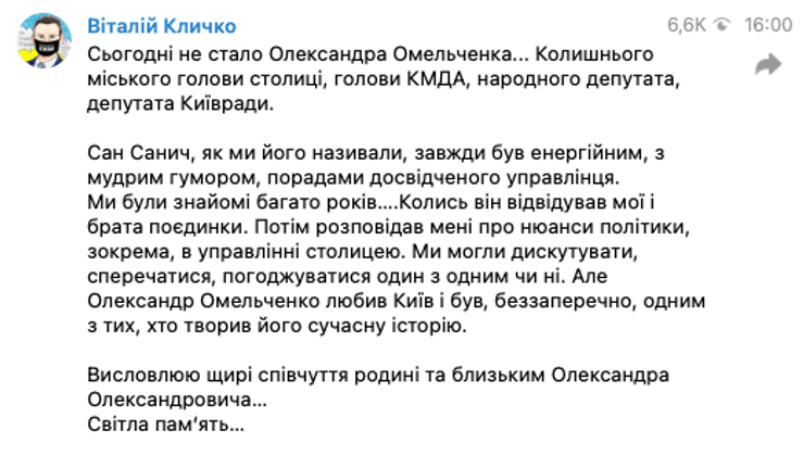 "Сан Санич, як ми його називали, завжди був енергійним, з мудрим гумором, порадами досвідченого управлінця. Ми були знайомі багато років... Колись він відвідував мої і брата поєдинки. Потім розповідав мені про нюанси політики, зокрема, в управлінні столицею. Ми могли дискутувати, сперечатися, погоджуватися один з одним чи ні. Але Олександр Омельченко любив Київ і був, беззаперечно, одним з тих, хто творив його сучасну історію", — розповів він.