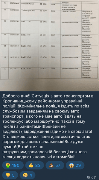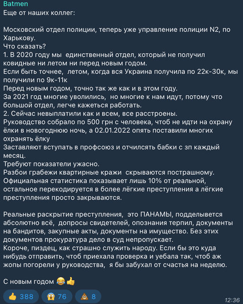 Користувач під ніком Batmen опублікував у цій групі низку повідомлень зі скаргами на умови праці, які, за його словами, надсилають співробітники поліції. Зокрема, правоохоронці незадоволені безпідставним позбавленням їхніх премій і відсутністю "ковідних" виплат, на тлі чого фактична зарплата поліцейського становить майже 13 тисяч гривень. При цьому співробітникам поліції доводиться зі своєї кишені оплачувати паливо для автомобілів, що використовуються під час роботи.