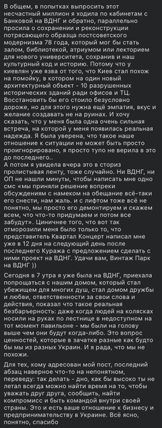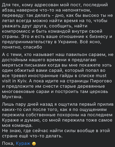 "Але навіть якби ми вирізали і вставили всі покращення, що зробили в павільйоні 19 на 6 млн гривень за три роки, крім оплати оренди, ми все одно й близько не наблизилися б до того, що мали вже. Але він запропонував що міг", — написала засновниця фестивалю.