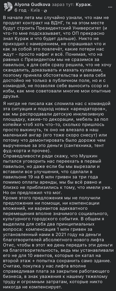 Авторка посту також пояснила, що вона вирішила не "боротися" за павільйон з президентом і просто "прийняла обставини", незважаючи на те, що їй та команді "Куражу" частину меблів та декорацій фестивалю довелося продати "за пів копійки", а решту "просто викинути". Гудкова зазначила, що генеральний директор ВДНГ Євген Мушкін пропонував проводити "Кураж" у новому павільйоні.