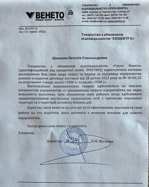 "Епіцентр" вилучає з продажу всю військову продукцію постачальника ТОВ "Група Венето" у зв'язку із поширенням інформації про причетність компанії до схеми розкрадання гуманітарної допомоги для українських військовослужбовців.