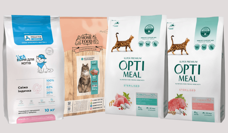 Сухі корми класу суперпреміум українського виробництва відрізняються високим вмістом тваринного білка, до їх складу входить свіже м'ясо, раціони добре збалансовані під потреби стерилізованих котів і кішок. Раціони Optimeal і Home Food збагачені різними добавками для здоров'я, корм Practik приваблює доступною ціною. Порівняння складу цих кормів і імпортних раціонів суперпреміум дозволяє дійти висновку, що вітчизняна продукція за рядом параметрів навіть перевершує зарубіжні аналоги, а коштує вона значно дешевше. Незважаючи на складнощі воєнного часу корми можна замовити через інтернет, а продукція Optimeal також у наявності в мережі офлайн-магазинів.